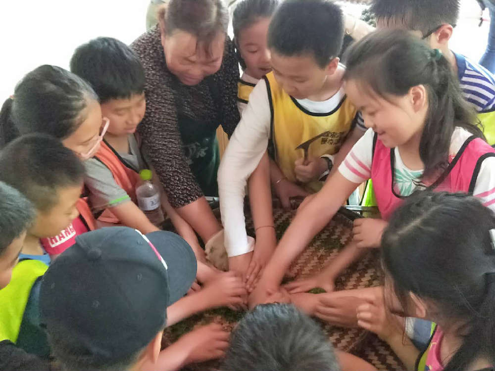 感受完采茶,我们来到了茶叶手工制作中心。绿茶的加工过程是摊凉、杀青、揉捻,做形,干燥。在加工中心,看着阿婆满头大汗的用手揉捻茶叶,孩子们顾不上茶锅的温热,纷纷用自己的小拳头去揉一揉,捻一捻。