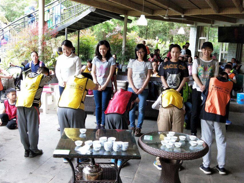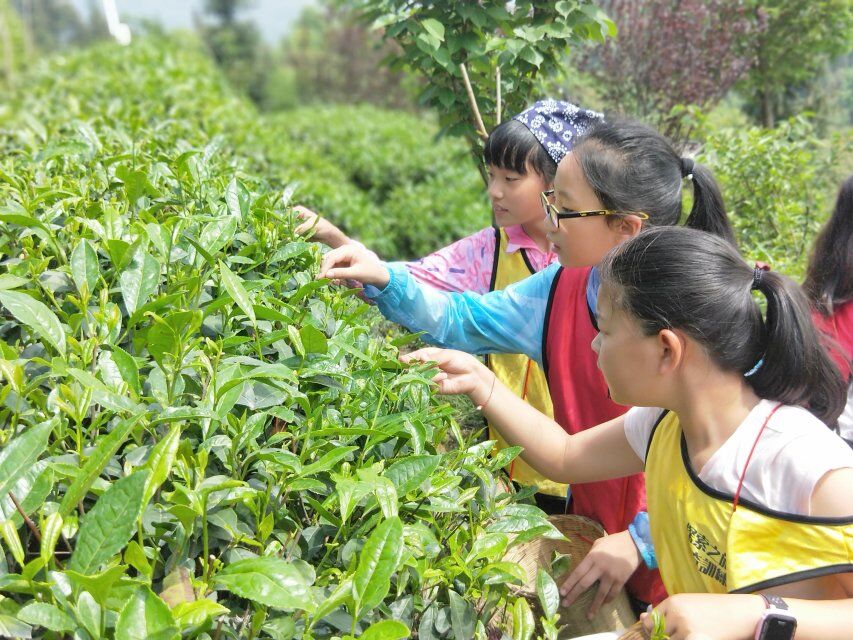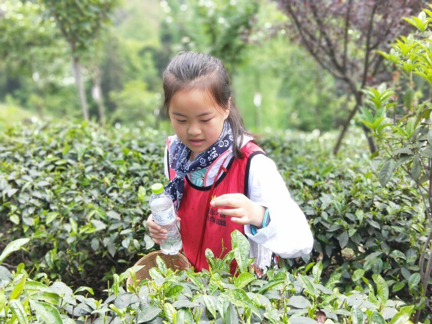 来到活动基地,天空已经放晴,好一派热闹的场景。一系列的热身活动后进行分组。然后,在教练的带领下去往久违的采茶地头,一眼望不到边的茶树,整整齐齐的排列在山坡上,穿着各色衣服的采茶小组成员和自己的父母们不停的穿梭在茶树之间。“一芽一叶……”孩子们不停的嘀咕着采茶要求,用拇指、食指齐用劲,轻轻掐,使劲扯,认认真真,忙得不亦乐乎。