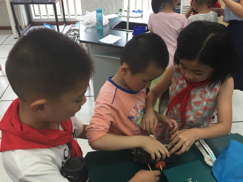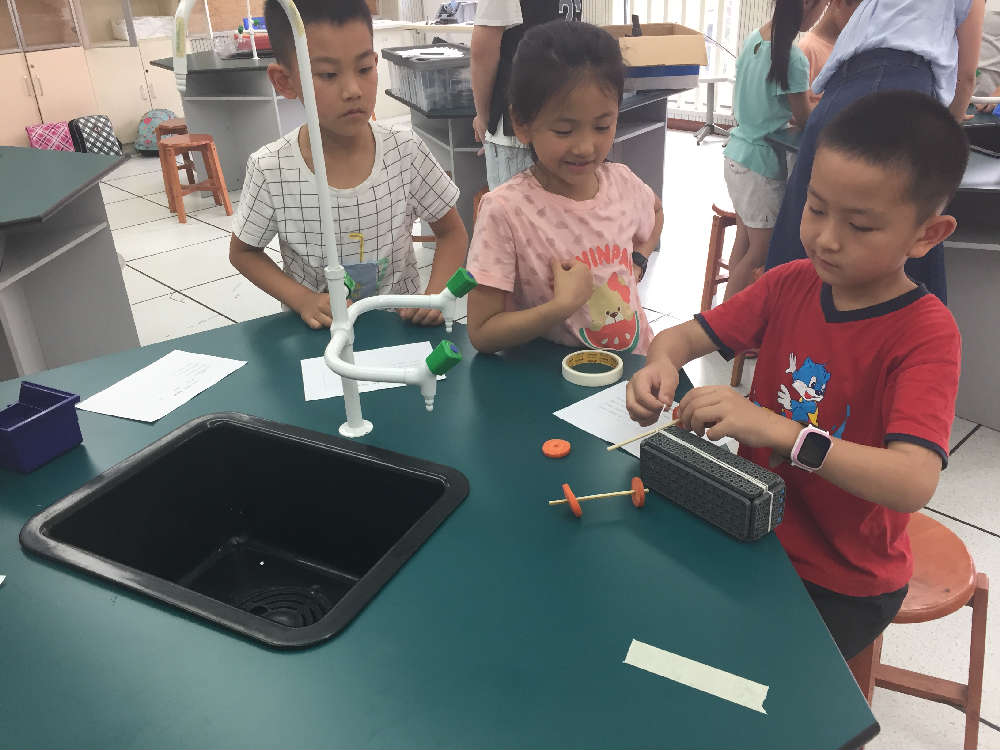 左老师提前给大家准备了丰富的实验材料,一个重物,两个小木棒,两片胡萝片,首先给小朋友们出了个难题,你可以用老师给的实验材料拉动这个重物沿着桌子移动一周吗?当看到实验材料时,学生有的疑惑,有的跃跃欲试,不管怎样,小朋友积极参与到这个解密活动中,认真思考,开始尝试着让自己的小车动起来,开始行动吧!