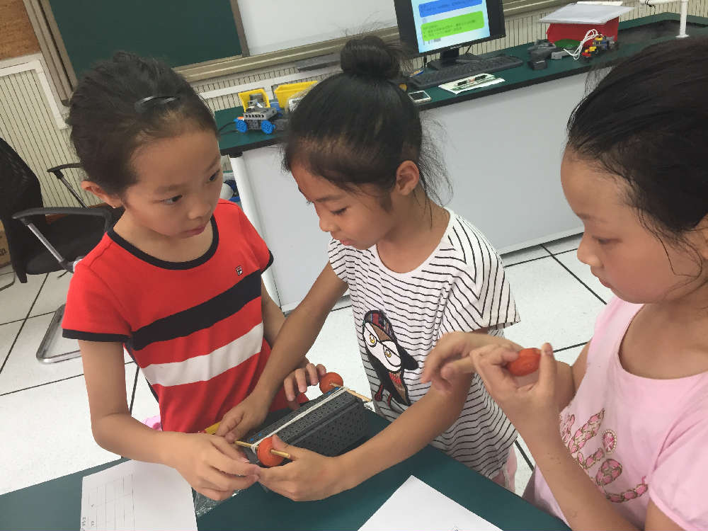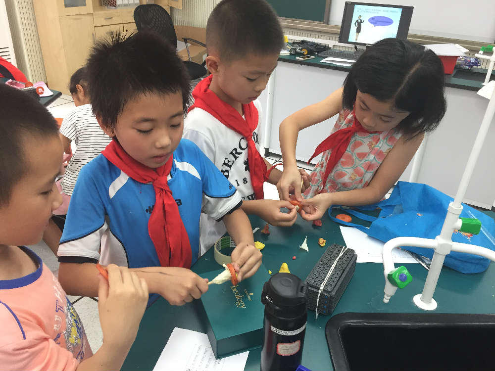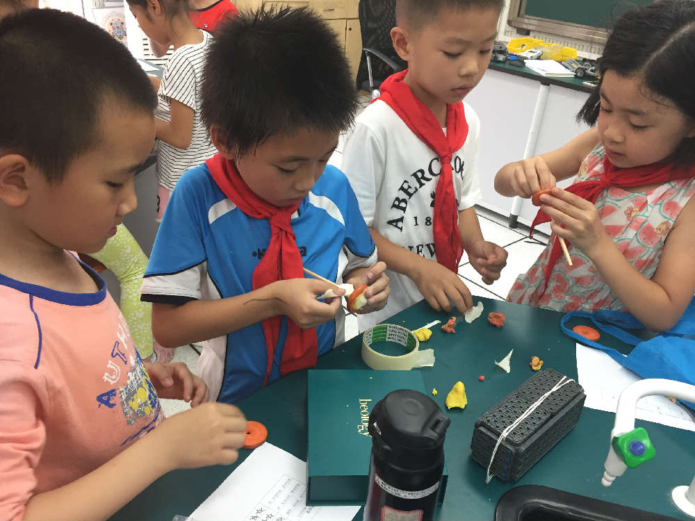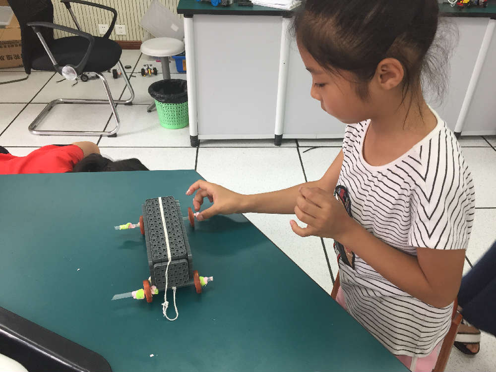 遇到问题就想办法解决问题,培养学生发现问题解决问题的科学素养是创客活动的教学目标之一。孩子们再一次投入到自己的解密中,这次充分利用了自己带来小助手“吸管,橡皮泥和胶带”,相信这次会有不一样的收货,每个小组分工明确,有的拿着橡皮泥,有的手扶着吸管,有的开始用胶带固定轮子和轴,好和谐啊,左老师轻轻的走到他们身边,悉心地引导着他们。