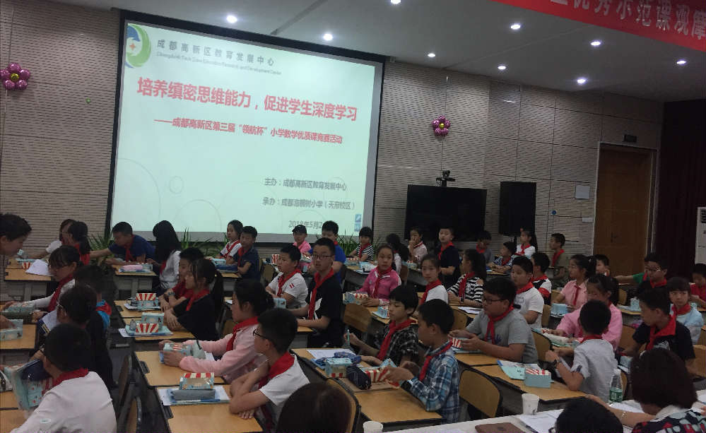 2018年5月24日泡桐树小学(天府校区)承办了成都市高新区第三届“领航杯”小学数学优质课竞赛活动,此活动由成都高新区教育发展中心主办,以“培养缜密思维能力,促进学生深度学习”为主题。来自墨池书院、科大附小、新华学校、庆安学校、大源学校、成外附小美年校区和新科学校的七名优秀教师呈现了精彩纷呈的课堂。