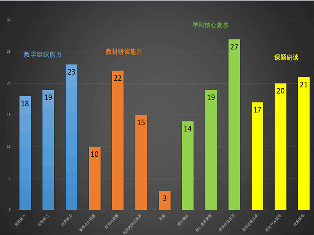 数学组李亮老师利用各项需求人数的频次柱状图非常直观的呈现出数学组教研需求的分布状况——“教学组织能力”和“教材研读能力”需求以年轻老师为主,而“学科核心素养”以及“课题研究”则是全员性的需求。