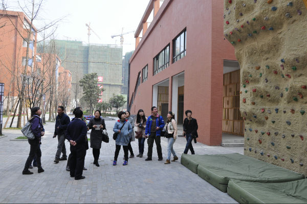 在国学大道上,校长助理陈冠夫向各位老师们介绍了我校的文化建设思路,即以书法演变、诗歌发展和竹简为载体的国学文化建设,以及以灯箱千字文、石刻论语为主的国学文化景观建设,得到了各位老师的赞赏;随后代表团一行参观了我校的班级文化建设和学生作品展示墙、天府艺术中心、体育馆、生活体验中心、泡家厨房、攀岩墙、图书馆、音乐教室、书法教室、陶艺教室、通用技术教室、机器人教室等功能室,整个过程中,陈校助向各位老师介绍了功能室的功能建设和课程设置,并回答了到访老师的提问。