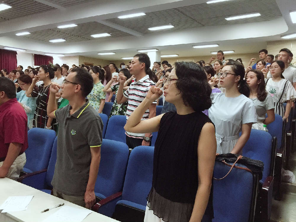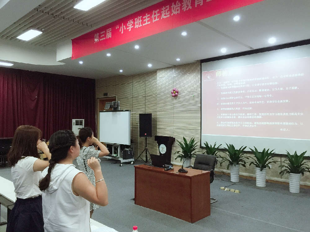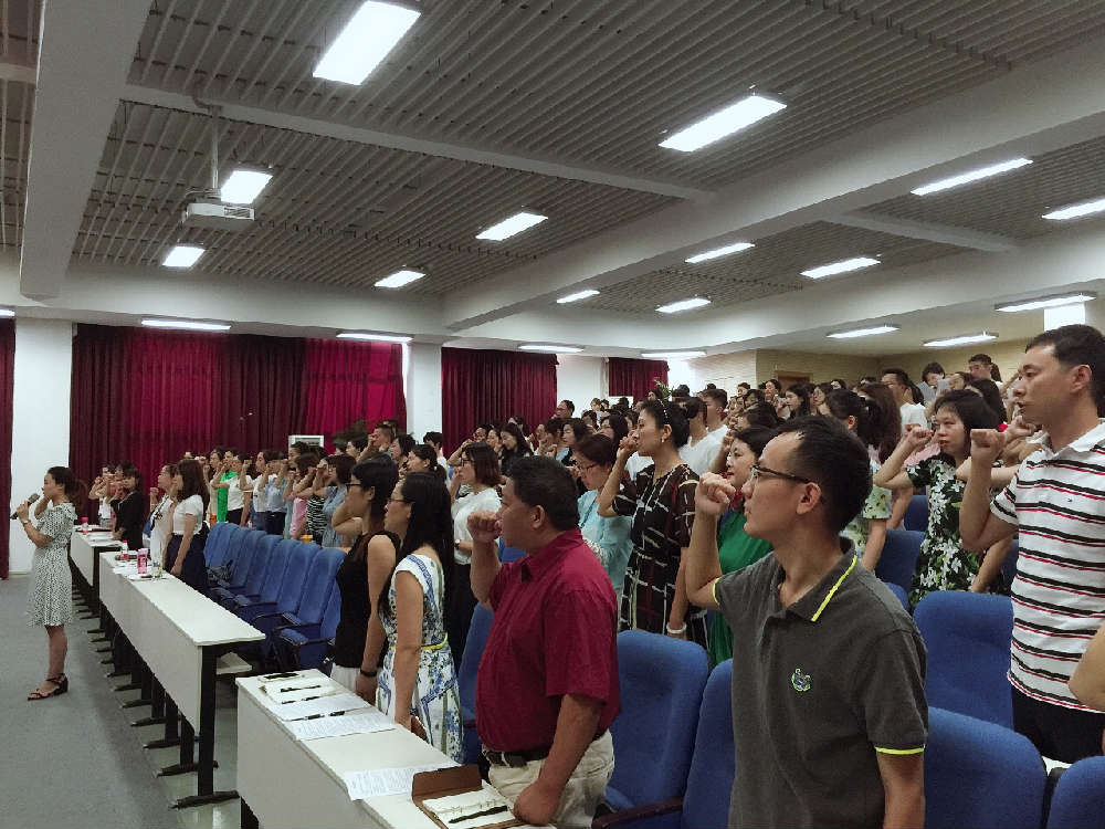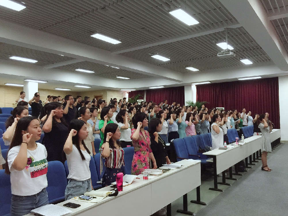 炎热还没退去,8月23日上午一股热浪又涌向成都市泡桐树小学(天府校区)多功厅。 休整两月的老师们满怀激情地回到了熟悉的校园,暂别的“战友们”见到了思念的面孔无比激动,关切的话语此起彼伏,心里的温度似乎已高于外界的热度。此时,学校教师发展中心欧小丽主任主持了开学工作会,重点强调了师德师风,尤其是会风。欧主任明确会议是为了提升认识、沟通信息、凝结共识、工作推进,希望大家正确看待开会。与此同时,学校本期将尽量减少会议,每周一次全校教师大会改不每两周一次,每次约40分钟,主要开展教师读书分享、教师教育教学经验、校园故事……希望大家尊重分享者、交流者。 紧接,姚满华老师带领全体老师郑重齐读《教师职业道德承诺书》,并庄严宣誓:我愿意全面贯彻国家教育方针,自觉遵守教育法律法规。我愿意忠诚人民教育事业,志存高远,勤恳敬业,甘为人梯,乐于奉献。我将关心爱护全体学生,平等公正对待每一位学生。我将在教书育人中以人为本,面向全体学生,促进学生全面发展。我坚决做到为人师表,作风正派。我愿意全身心致力于教育、教学工作,坚持用终身学习理念来努力提高专业才能和专业服务水准,满足社会对教育的期望。我会尽我所能去坚守自己的职责,避免出现影响或损害职业道德的行为,以此赢得家长和社会的信任、支持以及合作。宣誓后,全体老师在《教师职业道德承诺书》上郑重签字。 不忘初心,砥砺前行!作为一名教师,我们将追寻并恪守教师应有的道德品行,成为一位有职业道德感的人民教师。
