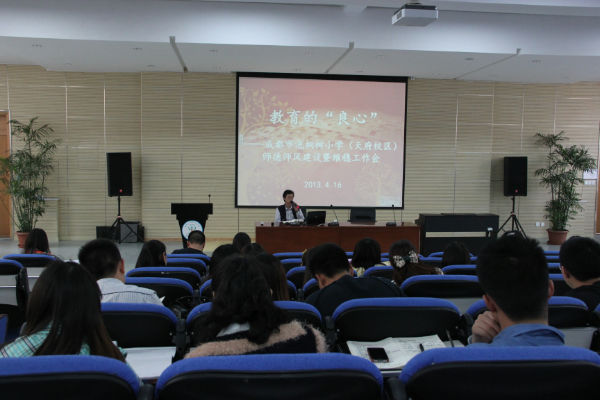 4月16日下午放学后,成都市泡桐树小学(天府校区)召开全校会议,会议围绕着“教育的“良心““这个主题展开。