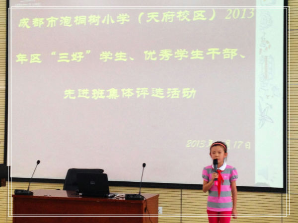 本次评优活动的评委由6名学生代表、6名家长代表和5名教师代表组成,分别通过候选人现场自我介绍、评委投票、现场统票、现场公布结果几个环节完成。最终在11名“三好”学生候选人中按照票数由高到低的顺序产生8名区“三好”学生推荐名单;在10名优秀学生干部候选人中按照票数由高到低的顺序产生4名区优秀学生干部推荐名单;在5个“先进班集体”候选班级中按照票数由高到低的顺序产生2名区“先进班集体”推荐名单。未被选入推荐名单的候选人和候选班级将被评为成都市泡桐树小学(天府校区)2012—2013学年(下)校级“三好”学生、优秀学生干部和先进班集体,并于本学期期末进行表彰。