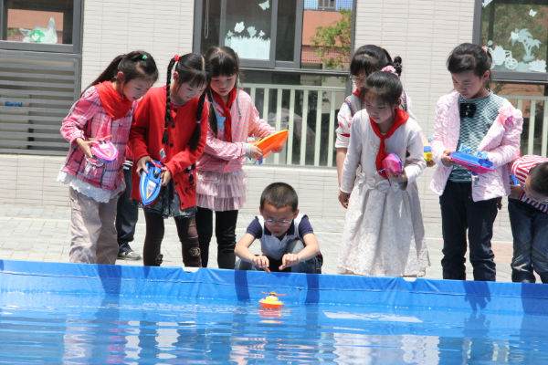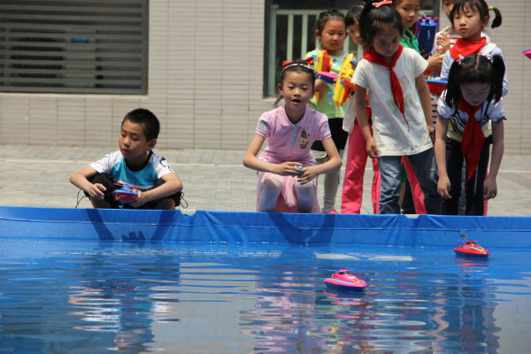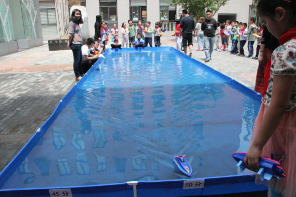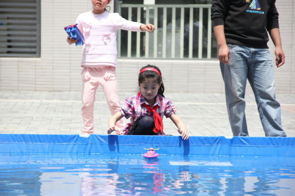 随着裁判一声令下,各选手放开自己制作的船模,一艘艘身披祝福彩带的“轮船”遨游在海模池中,划出了一道道美丽的水波纹。小选手们紧张地手握拳头,绷紧了脸,咬着牙,好像要把自己的所有力量都使到小船上去。