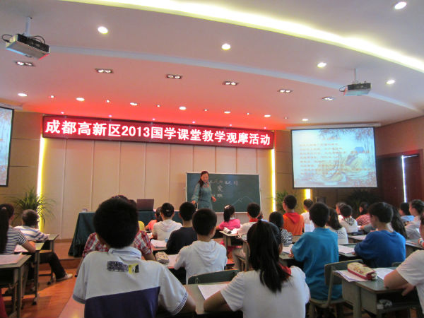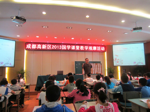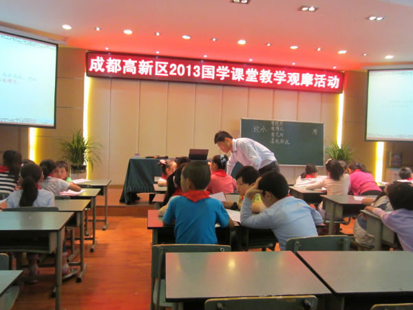 4月19日,成都高新区2013国学课堂教学观摩活动在玉林附小低小部隆重举行,本次活动邀请到四川师范大学、成都大学等多所高校的专家作评委,高新区各小学国学总辅导员及部分老师参加了活动。我校周强老师在语文教研组组长宁超群老师和张蓓佳老师的陪同下参加了本次比赛。 执教本次观摩课的老师都是在4月12日片区赛中获胜的选手,锦城小学张红梅老师的《送别诗组》,还是大源学校的许献文老师带来的《节俭》,亦或是玉林附小任红英带来的《走进苏轼》,大家风格各异,特色鲜明,四堂国学课都给听课的老师带来艺术的享受,视觉的冲击,人生的启迪。