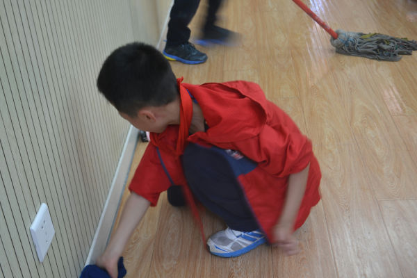 活动中,孩子们首先打扫了自己区域的卫生,接着又参与到公共区域卫生的打扫。孩子们争着抢着擦地板,擦桌椅、搬桌椅,很快就把教室打扫得干干净净。一张张汗湿的笑脸洋溢着快乐的笑容,那笑容是如此的灿烂,看着干净整洁的教室,孩子们感受到了劳动的快乐。看着孩子忙碌的身影,老师看到了孩子们的成长。