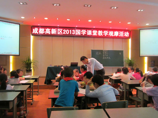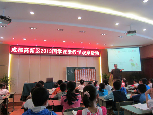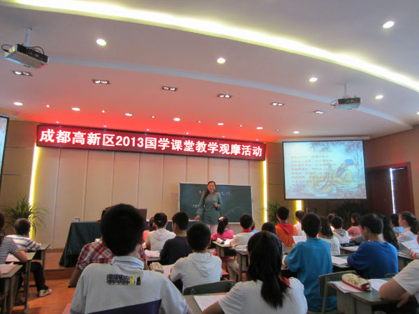 3月—4月,高新区社会事业局组织开展全区中小学国学课堂教学观摩活动。此次活动主题为“传承经典,奠基人生”,分校内初赛、片区复赛、全区决赛三轮进行,全区共34位教师(小学16位,初中13位,高中5位)参加了复赛和决赛活动。成都市国学教材编委、四川师范大学教授余虹,成都大学副教授范红担任专家评委并做现场点评。市教育局领导、市语委专家、市教科院国学教研员亲临现场指导给予了高度评价。
