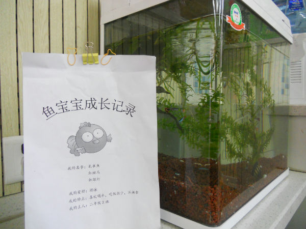 嘘,听到了吗?那是小鱼唱歌的声音。教室后方的水族馆里,三种可爱的鱼宝宝在和我们招手呢,它们的名字也很可爱,有孔雀鱼、红斑马和红绿灯。小泡泡很喜欢教室里的新朋友,他们下课观察,看到有水渍就会轻轻擦去,他们自发照顾小鱼宝宝,想象小鱼在里面是否快乐和安心。小鱼宝宝也很爱这群小泡泡,它们在这里和小朋友们一起上课,写作业,分享自己的故事和快乐。
