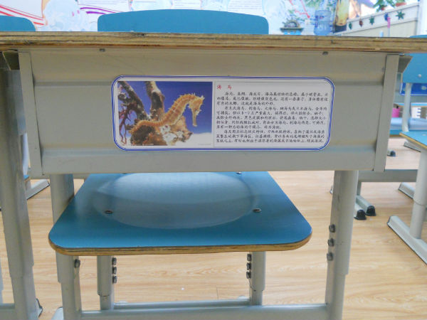 每一个小朋友的桌子前面都有一种海洋生物的图片和文字介绍,下课的时候经常可以看到小朋友蹲下身子在哪里欣赏,嘴里还念念有词。