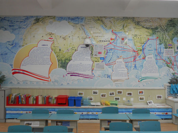 本次设计主要以郑和下西洋为主线,教室整个文化以郑和下西洋的航海图为底图,呈现了郑和下西洋主要访问的国家,从中国出发,到达泰国、印度、阿拉伯半岛东南区域,以及最远到达非洲,我们以此为契机,向学生展示这些国家的人文、地理、历史和文化的内容,开启智慧园小泡泡起航的梦想。