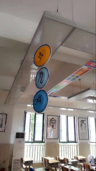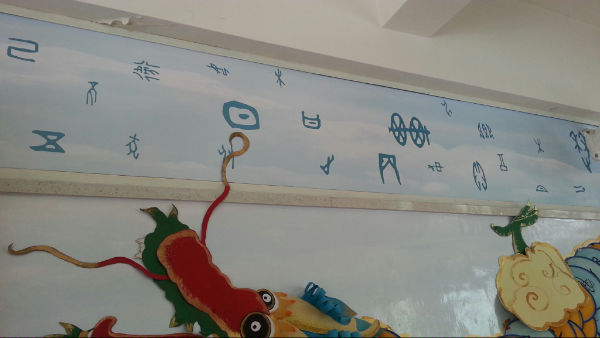 另外围绕在教室前后墙上的一排甲骨文字,也是错落有致的排列着,这些字中有孩子常见的,也有不怎么好认的,相信他们一定会在课间去研究、去发现。