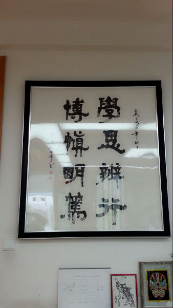 “龙”是中华民族的图腾,象征着一种奋发的精神!这也是中华民族千百年来的优秀传统。因此教室后墙上正是一条奋起向上的蛟龙。这条龙的龙头是全手工剪成的,鳞片是由三百多个塑料纸盘组成的,他们经过家长们的染色、勾边,变成了现在的样子,另外,纸盘背面由孩子们书写上了各个时期的、不同形态的龙字,有甲骨文、有金文、有隶书、有小篆…….通过孩子们一丝不苟的书写,他们初步了解了汉字的演变历史,也知道了:哦,单就这个龙字就有这么大学问。