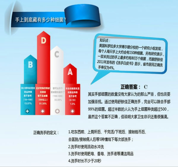 根据国民洗手调查”的结果发现:超过50%的人认为手上的细菌超过500种,15%的人认为手部细菌小于15%。,说明大家卫生意识还是很强的。