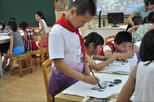 接下来,由来自锦晖小学美术组的卿恬老师带来一堂有浓厚中国文化特色的,综合.探索领域的《彩墨游戏》。卿老师教龄尚短,但其扎实的美术专业水平和对课程的精心准备和打磨,以及与三年级一班学生的亲切互动,也让此课平凡中见奇绝!