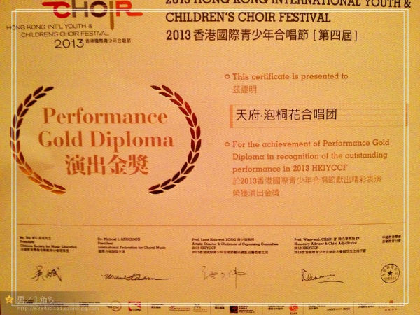 我团于2012年12月收到香港童声协会的邀请函,经过紧张而辛苦的排练,于2013年7月14日——19日赴港参加比赛。经过由匈牙利 SomaSZABQ先生担任组长的评审组严格评审,我团获得了表演金奖和比赛银奖的好成绩!这样的成绩对于稚嫩的“天府.泡桐花合唱团”而言是莫大的鼓励和鞭策!