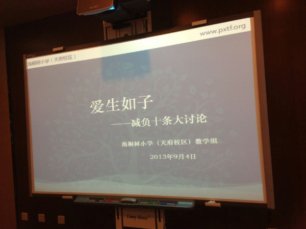 2013年9月4日星期三下午2点,外面飘着细雨,淡淡的凉意充斥着校园。泡桐树小学(天府校区)国际会议室正召开着数学组进入9月以来第一次集体教研活动。本次研讨主题:减负十条学习与本学期计划研讨。本次活动教学管理部游琼英主任和欧小丽副主任均到场指导。