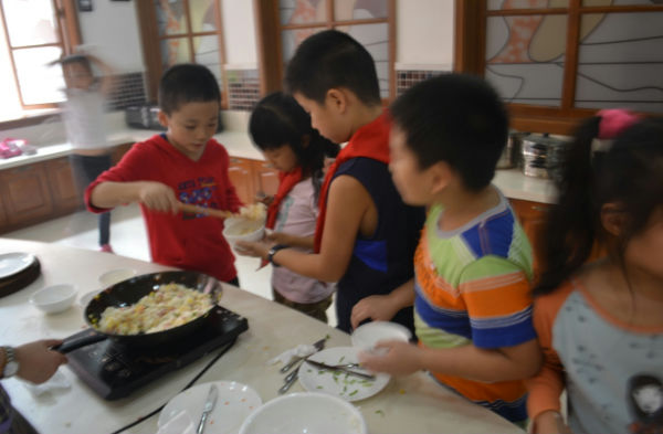 面对桌子上缤纷诱人的食材,孩子们尽力地抑制住兴奋,安静的聆听主讲杨阿姨传授扬州炒饭的制作方法。“把胡萝卜切成丁、要先炒虾仁、豌豆、鸡蛋,鸡蛋要炒的鲜嫩……”杨阿姨不仅细心的讲解,而且还不时的和学生互动,现场气氛热烈极了。讲解过后,到了同学们大显身手的时候了,每个小组每个人都分配到了任务,有的忙着切丁、有的炒豌豆、有的小朋友边交流边操作,都在井然有序地进行着。