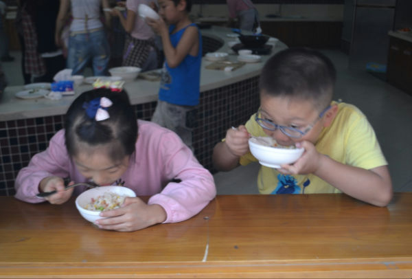 学生们在分享扬州炒饭