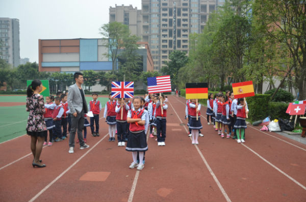 “一年356天,总有一些值得纪念的日子……成都对于世界很重要,世界对于成都也很重要……”随着主持人的激情介绍,同学们踢着足球,打着非洲鼓,拿着汽车模型,迈着轻盈的步伐,跳着斗牛舞登场了。在同学们的表演和介绍中,我们知道了足球是巴西的国球,德国是世界上的汽车王国,英国是绅士的国度,国庆日是女王伊丽莎白二世的生日,西班牙的国旗由红、黄两色组成,象征着人民对祖国的一片赤胆忠心……