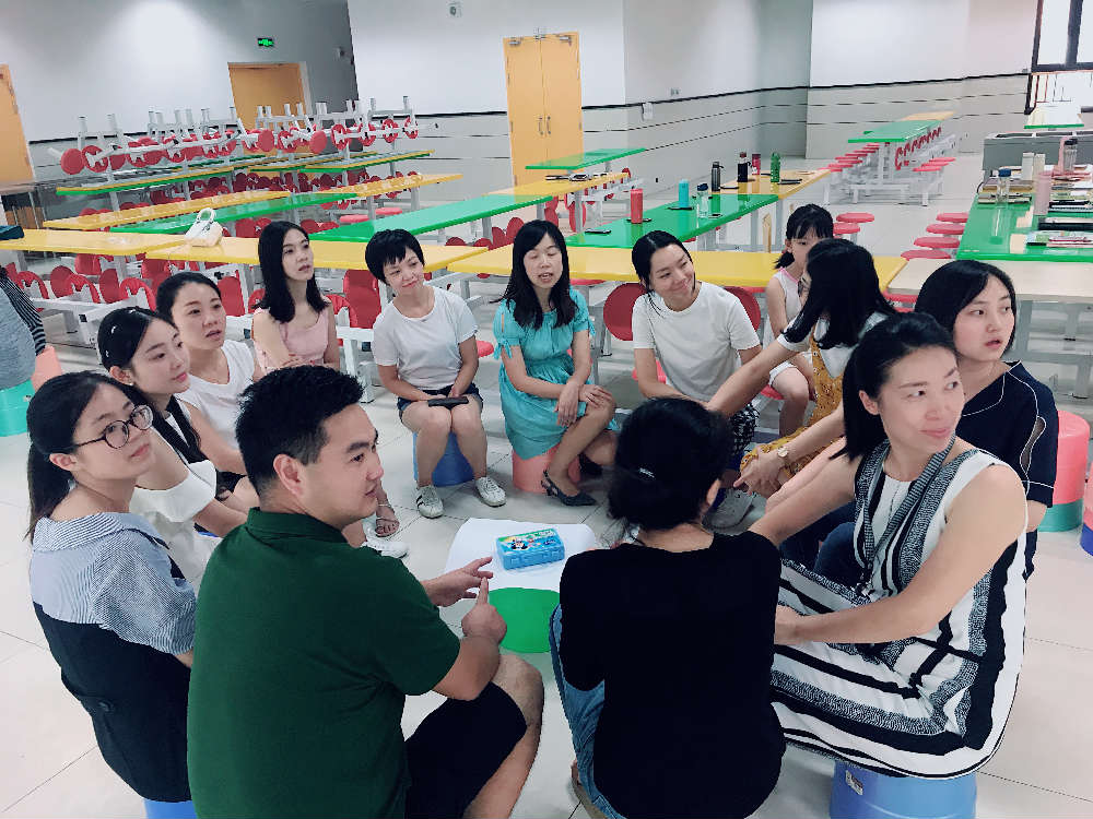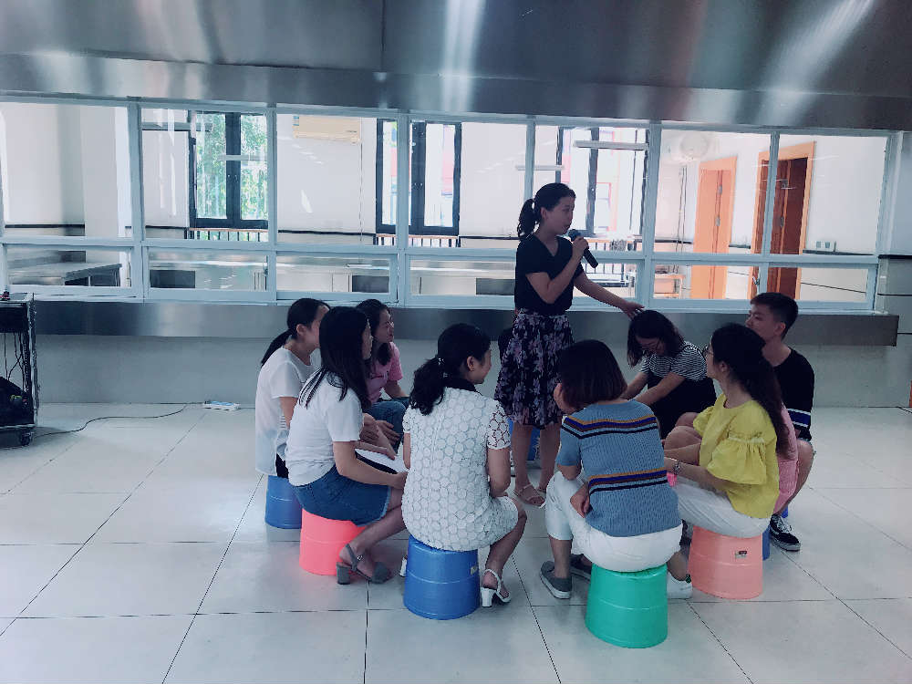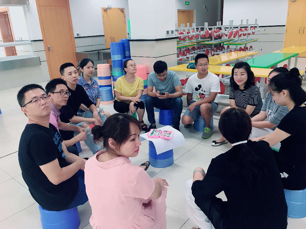第三个活动:连环介绍。刘老师让12名老师一组,在组内完成所有成员的介绍,按照“老家、年龄、爱好、姓名”的固定格式,让老师们认识了彼此。