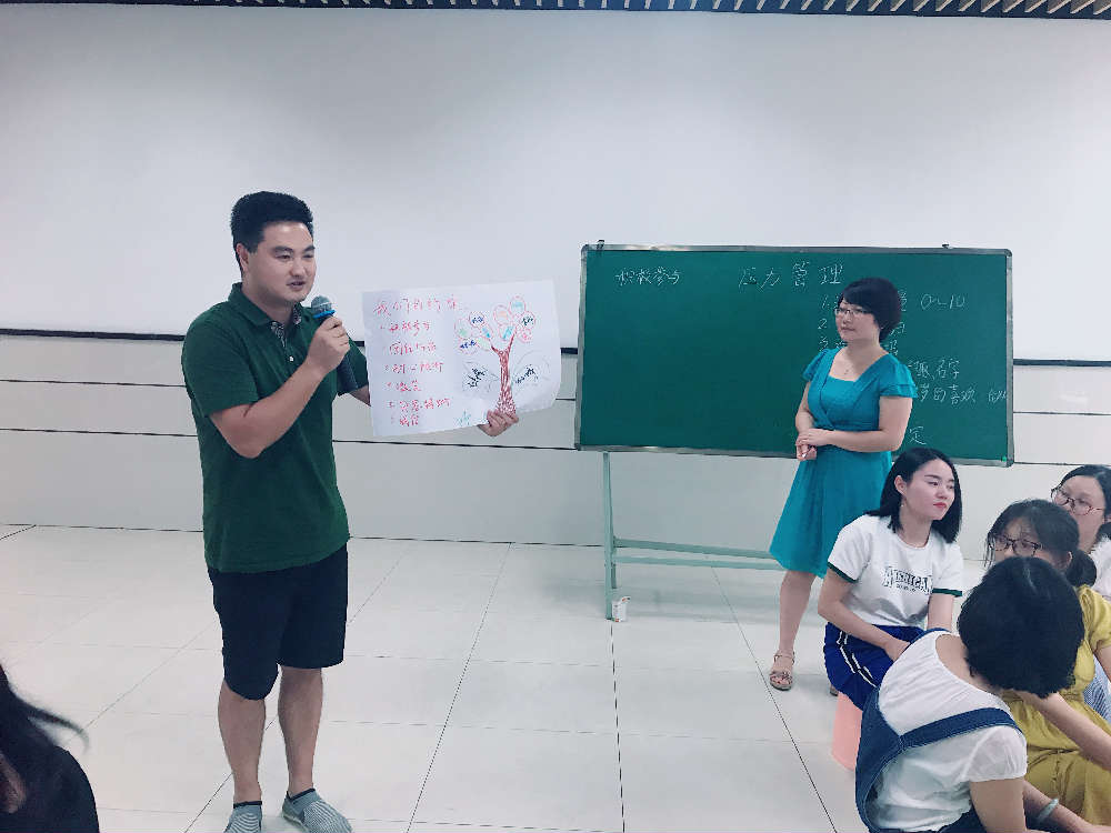 第五个活动:摆脱困境。在舒缓的音乐声中,在刘老师生动的描述中,老师们闭上眼睛,选择了自己最舒适的姿势,经历了一次心灵的美妙旅行。接着刘老师让老师们用画画的方式表达出刚才醒过来的感受、最近的压力、如何解压以及解压之后的感受。最后请了三位老师分享,刘老师做来精彩的点评。她说缓解压力需要社会支持,可以找同伴倾诉,也需要生理支持,可以适当参加一些运动,更需要心理支持,学会从书本中,从别人的故事中释放压力。