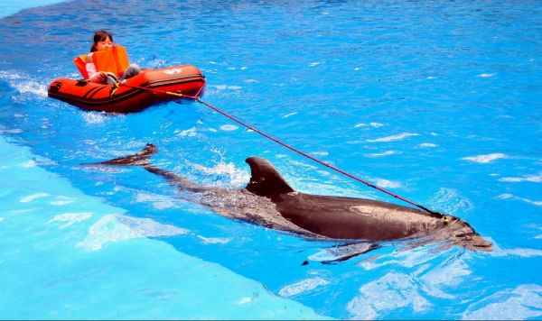 在孩子们兴奋地呼喊着奔跑着兴趣正浓的时侯,“欢乐剧场” 的海豚表演开始了……。