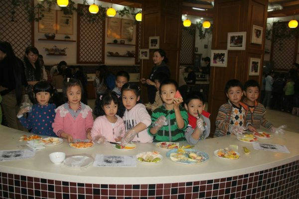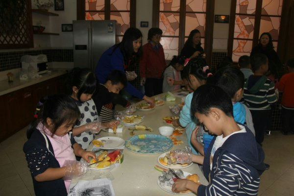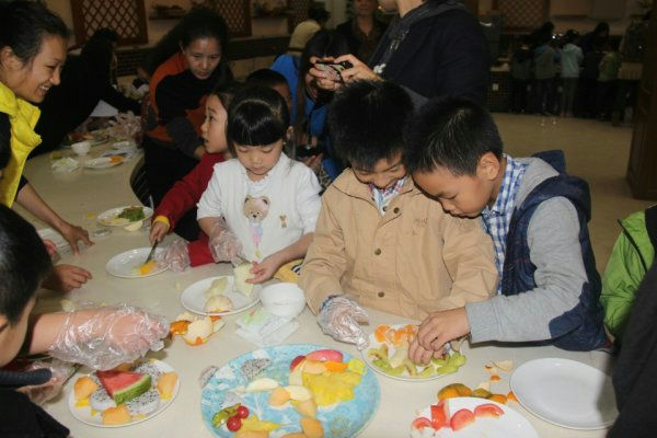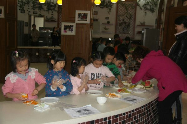 在泡家厨房的餐桌上早已摆满了一九班的十多位泡妈们精心挑选以及清洗摆放好的各种新鲜水灵的水果以及餐盘。面对各种水果,跃跃欲试的小泡泡们按照事先分配好的六组到了各自指定的位置,开始了他们的奇妙课程。