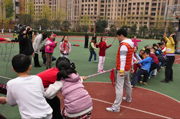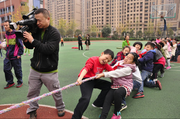 11月13日上午,我校操场传来孩子们阵阵欢笑声,原来这是4年级2班、3班的同学们组成的烈火队、雪豹队正在进行激烈的飞碟、播种、拔河等游戏比赛。此次以“我运动、我健康,我快乐”为主题的阳光体育活动得到了四川电视台科教频道的关注,该台派了5名编导对此次活动进行全程录制。