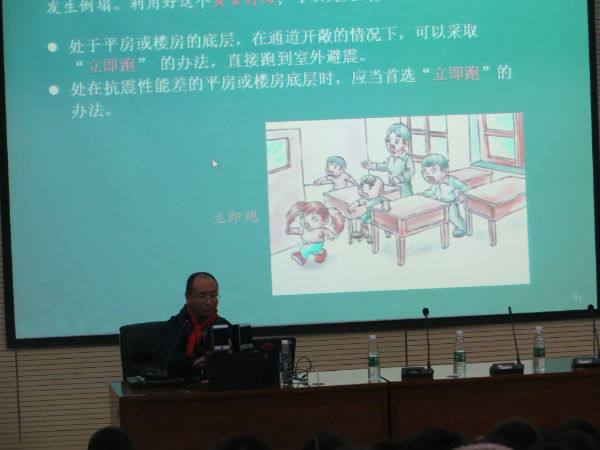正式讲座之前,由学生代表为谢洪教授献上红领巾。 为了激发学生的兴趣,谢洪教授以提问的方式进行引入:1、什么是灾害?2、我国的防灾减灾日是每年的哪一天?3、我国的防灾减灾日是从哪一年开始的?学生积极参与,气氛活跃。 今天的讲座内容丰富,主要围绕1、什么是山地灾害?2、常见的山地灾害有哪些?3、成都市有山地灾害吗?4、如何预防山地灾害?5、地震来了怎么办?来展开,向学生呈现了大量的现实照片和视频,给学生们带来了一次山地灾害和地震防灾减灾基础知识的盛宴,学生们听的津津有味,并积极参与讲座中的互动环节。