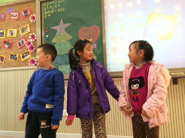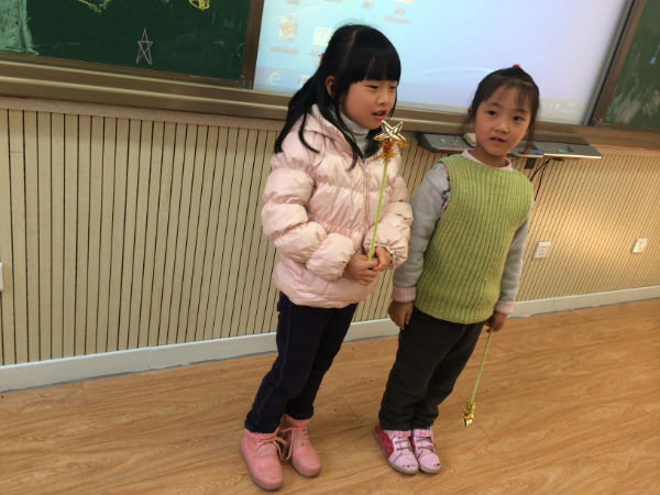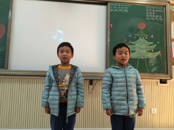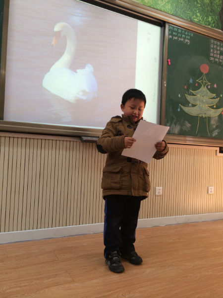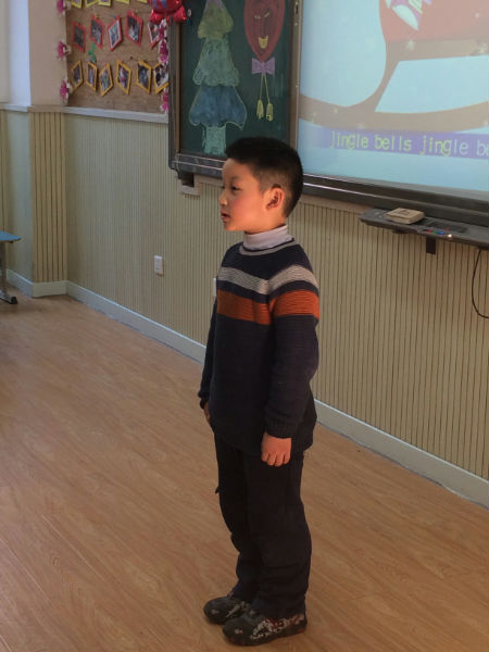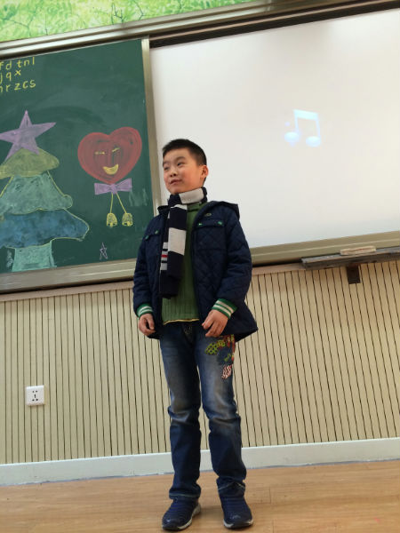 2013年12月13日下午,一年级九班的教室比往常热闹许多,教室后面整齐地坐着许多前来助阵的泡爸泡妈,教室前面大多数时候只有老师,今天却多了许多小泡泡,轮流上台展示各自在英语方面的才艺。有的泡泡唱歌,有的泡泡边唱边跳,有的泡泡诗歌朗诵,还有的泡泡用英语进行自我介绍。表演主题大多围绕着“圣诞”和“新年”,Jingle Bell大概是小泡泡们都会唱的圣诞歌曲吧,还有很多小朋友耳熟能详的英文歌曲,Twinkle Twinkle Little Star,Ten Little Indians…每逢这种情况,台上的表演都会得到台下热情的回应,跟着唱的,帮着打拍子的,可爱而热烈的互动。许多有心的泡爸泡妈还为孩子准备了服装、道具、伴奏音乐,连我们的诗歌朗诵都是在舒缓而优美的背景音乐中进行的哦。表演组合有单人秀,有两两配对,有三人搭档,甚至还有临时组建的team,更有即兴邀请泡妈上台共同表演的集体节目。