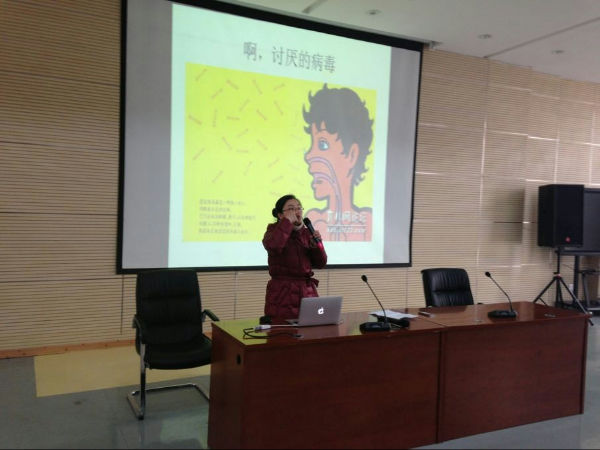 最近成都的天空很多时候被雾霾笼罩,加之入冬后天气渐渐寒冷,患感冒的泡泡也多了起来。为了使小泡泡们了解预防感冒的相关知识、强魄体质,12月18号下午一点钟一年级各班家委会特请到国家高级营养保健师李雪铭老师和泡泡家长桐妈为小泡泡们上了一堂生动的《冬季预防感冒》的主题讲座。讲座由问题:“为什么会感冒”开始,小泡泡们踊跃回答,如:穿衣服少了、运动出汗着凉、吃冷的东西、病毒传染等等。接着系统介绍了预防感冒的方法,如:早上洗冷水脸、勤洗手,科学穿衣,加强锻炼,晒太阳,室内保持通风,按摩穴位等等;尤其讲到营养均衡的重要性,使小泡泡了解到哪些食物吃了可以增强体质,以及这些食物的营养价值,还介绍了一些平日不常见但营养价值很高的蔬菜水果。三十分钟的讲座同学们都全神贯注,眼界大开,小泡泡们要把知识牢记在心,重要的是要付诸行动哟!