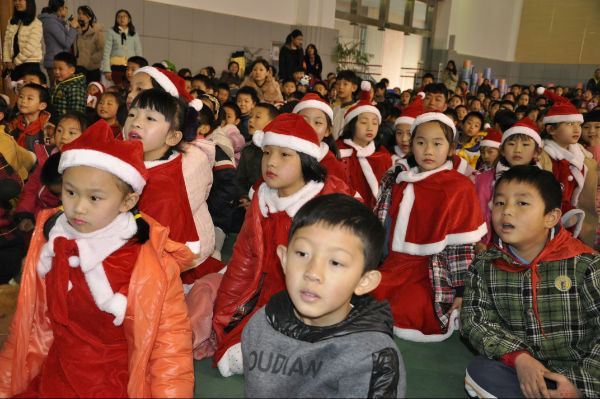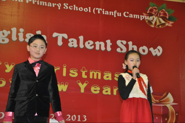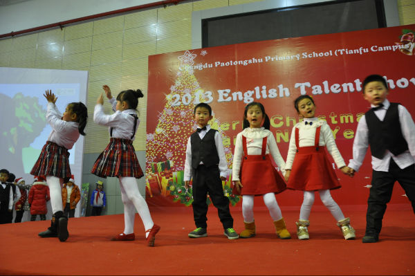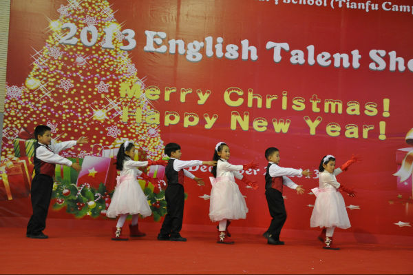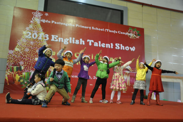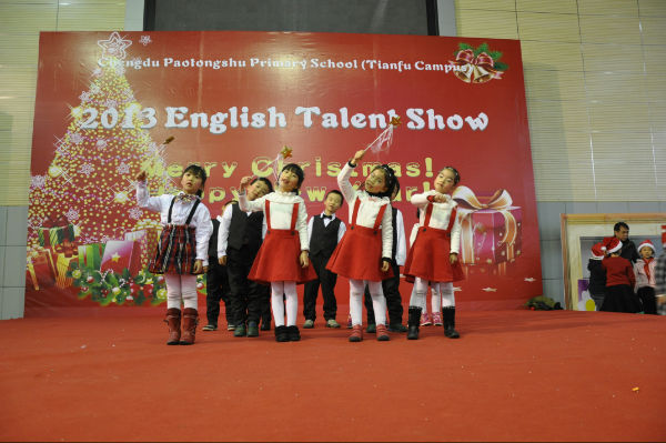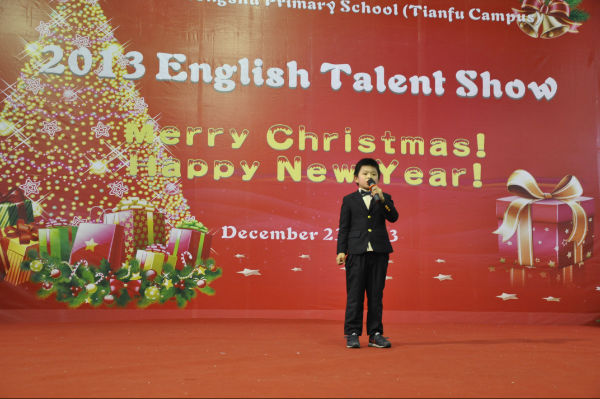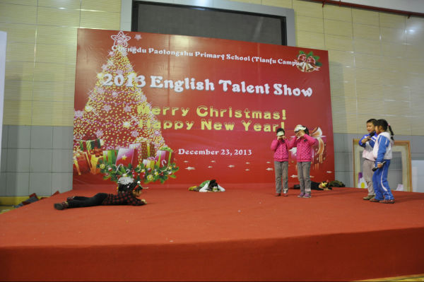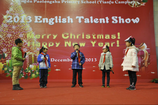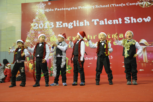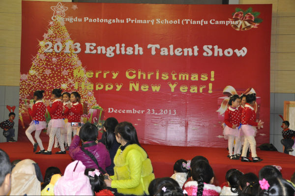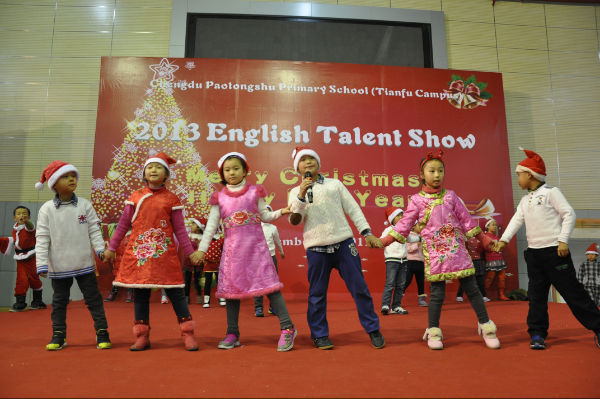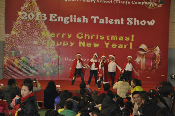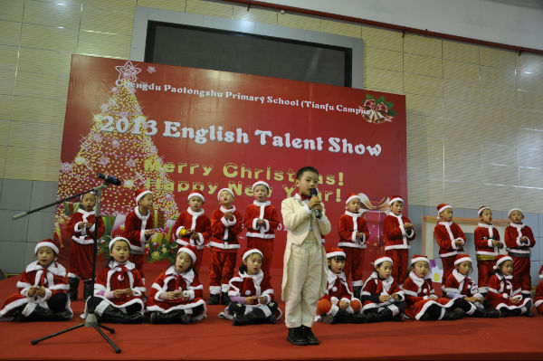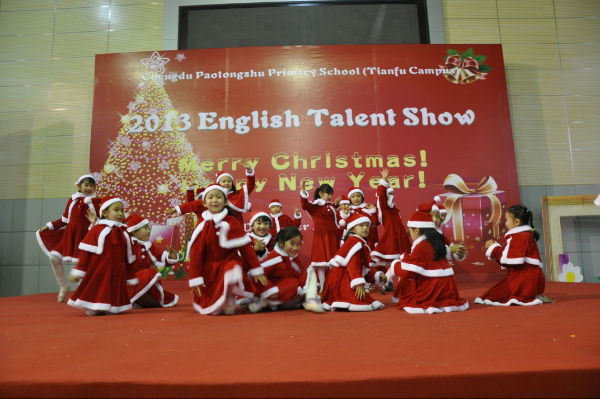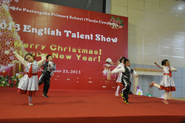 12月23日下午15:30伴随着动感的旋律、欢快的音乐,泡桐树小学(天府校区)“2013圣诞英文才艺秀”在学校体育馆精彩上演。歌曲大联唱、合唱、歌舞表演、课本剧、童话剧等等,多样的节目形式,丰富多彩表演,展现了泡泡娃们的聪慧、活泼和自信。