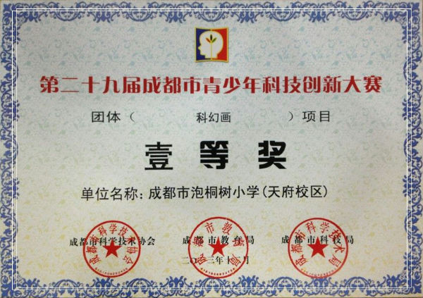 由成都市教育局、成都市科技局、成都市科学技术协会主办的“第29届成都市青少年科技创新大赛”科幻画比赛中,我校一、二、三、四年级的美术泡泡们团队作战,大放异彩!整体取得了优异的成绩,再创新高!本次大赛中,获得一等奖64名,二等奖29名,三等奖508名。由于我校学生整体突出的表现,并获得了科幻画项目团体一等奖。