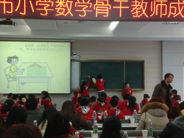 活动于上午9时准时开始,首先由成师附小的教研室梁主任介绍他们学校的课程特色和“长程链式教学”的研究成果,接着由成师附小贡献了两堂数学课。第一堂是《“量的计量”的复习》这节课与我们的分享式课堂有相似之处,学生课前自主整理,课堂上小组讨论,然后全班分享,最后巩固练习,取得了比较好的效果。第二堂《分数除以整数》,授课老师功底较为深厚,课堂上充满了浓浓的数学味。老师从情境中引入课题后,引导学生从“分数除以整数的意义”、“分数除以整数的方法”、“分数除以整数的运用”这三方面进行研究,学生先自主探究,接着汇报展示,在学生交流汇报时,老师注重引导学生通过画图来解释意义和算法,取得了良好的效果。