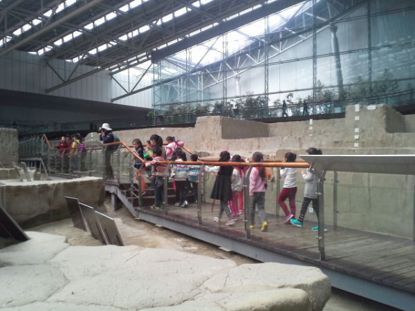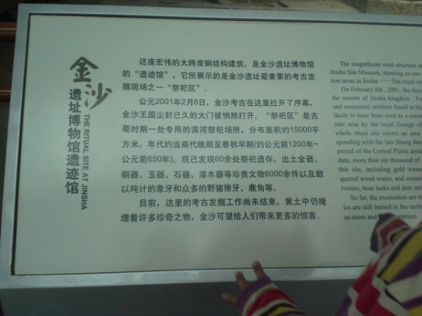 首先小朋友们在老师的带领下,来到了金沙博物馆的遗址发掘区,在这里,小朋友们非常直观地看到了金沙遗址,是怎么一点一点被考古工作者们挖掘出来的。整整齐齐的挖掘探方把土地分割成一小块一小块,每一小块土地上,都有各种古人使用过的工具,或者古人制造的器物,还有房屋的遗迹以及沉入河底的巨树。小朋友们被这些来自远古的神秘器物所深深吸引,纷纷追问老师,每样东西的来历和用处,一时间,每个老师都被许多小朋友围住,叽叽喳喳的提问题,让本来严肃静穆的博物馆,顿时充满了生机和童趣。