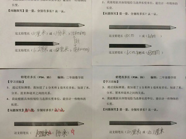 游老师说学生是学习的主体,课前需对学生进行简单的调研(做到课前就读懂每一个孩子)并主动站在学生的角度去思考、去提问。为什么要学习分米和毫米?1分米有多长?1毫米有多长?接下来呈现学生的问题,老师是为学生的问题存在的。在我们的活动中再对应解决这些问题,同时鼓励孩子创新、多动脑、多思考最后用不同的方法解决。
