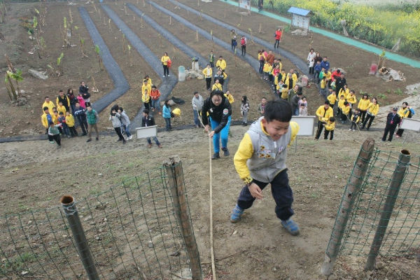活动进入白热化阶段,和爸爸一起去爬山瞬间让孩子们兴奋起来,男孩子胆大,女孩子心细,在爸爸的保护下,孩子们麻溜的爬上了山顶,在大树上系上自己写下的心愿彩旗。
