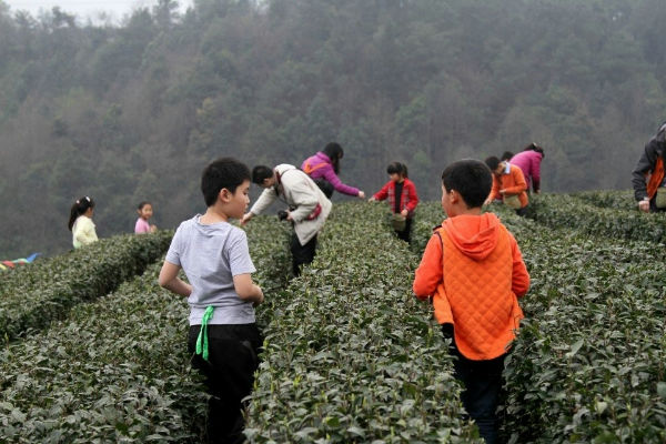 午饭后,在导游的带领下,按照路线要求,同学们来到茶园,在听过导游讲解采茶要领后,同学们进行采茶体验活动。看一个个的小采茶们多么认真呀。