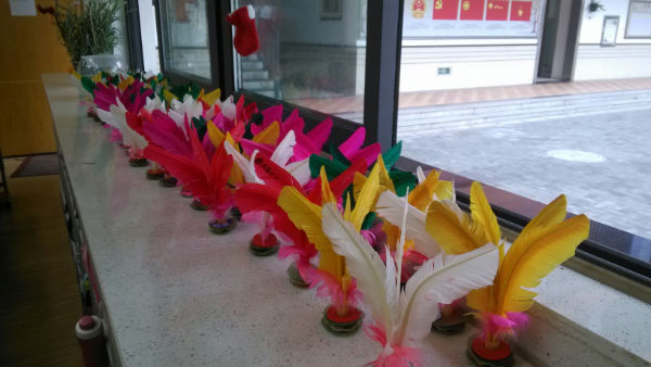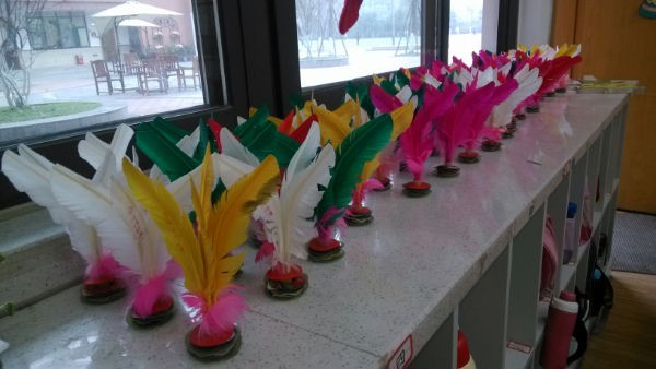 在小泡泡们的期待中,今天终于要开始学习踢毽子啦!瞧,五颜六色的羽毛,搭配起来多美丽。每一个毽子都是小朋友们自己动手制作的呢!