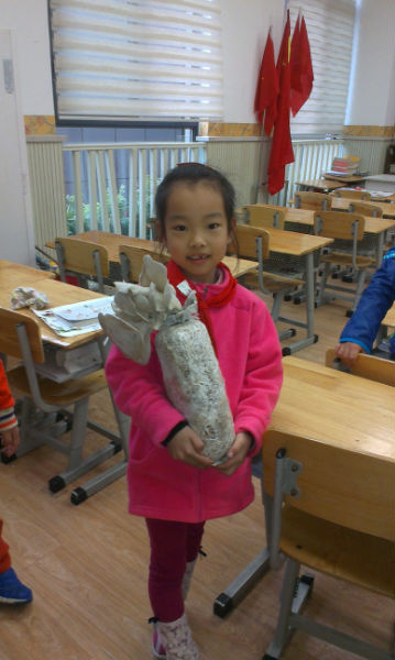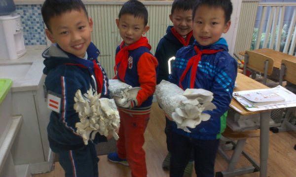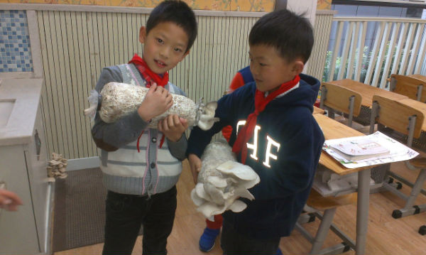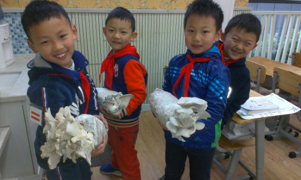在老师和同学的照料下,小蘑菇们现在已经探出来许多脑袋,争先恐后地长大了,孩子们在想