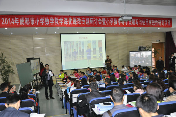 2014年4月4日9:00,由成都市教育科学研究院主办、我校承办的“2014成都市小学数学教学深化改革专题研讨会暨小学数学导学案编写与使用有效性的研究活动”,在我校阶梯教室举行。来自成都市各小学近300名教师参加了此次活动,大会由成都市教育科学院张碧荣老师主持。