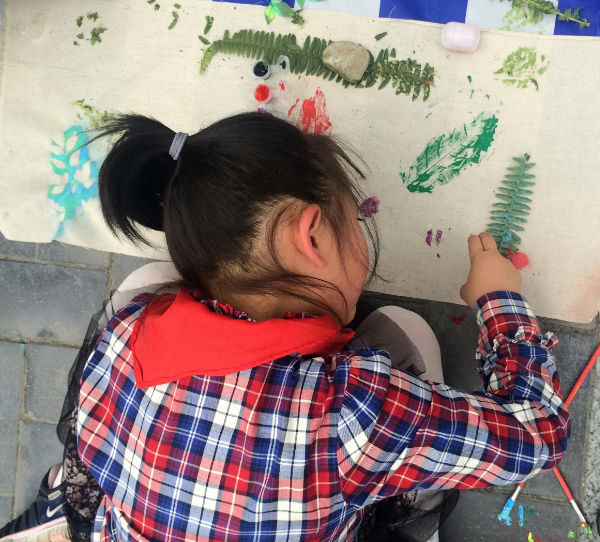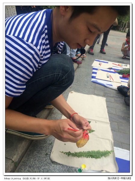 看见这些材料了吧,树叶、石头、布……,生活中天天见到的、再普通不过的东西今天却要发挥不一样的作用。比较干的树叶用来拓印,先将颜料涂在叶子背面,然后用手掌按压在布料上面,再轻轻揭去叶子。比较新鲜湿润的叶子是用来染印的,将叶子放在布料上面,用石头轻轻敲击树叶,直到树叶的纤维完全渗透到布料的纹理中去。