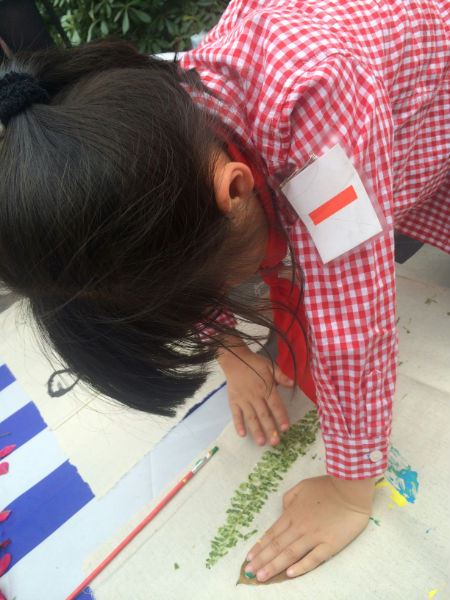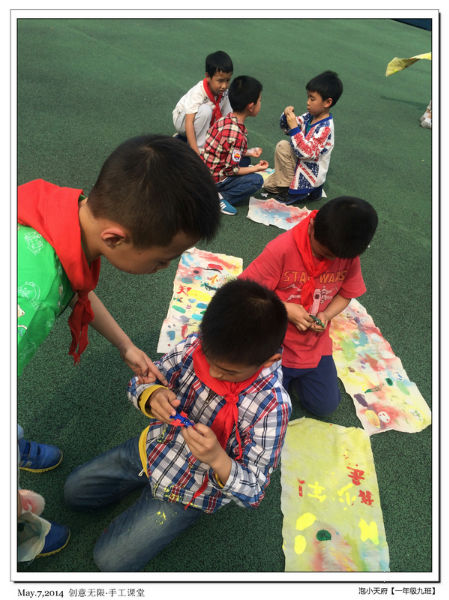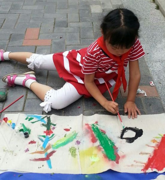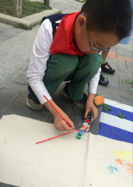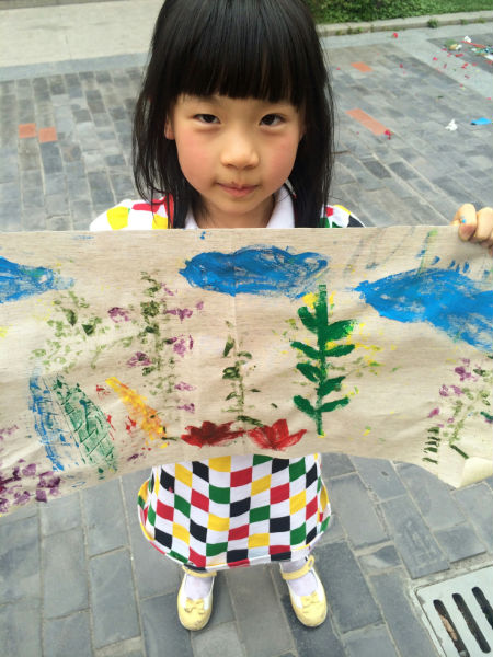 听完卓熙妈妈的讲解后,小泡泡们唏嘘不已,迫不及待地想亲手大干一场。看看这些艺术家吧,完全不顾形象地投入这场艺术创作,有的蹲、有的趴、有的跪,也顾不得清理手上、头发上、脸上、衣服上不小心沾到的颜料。