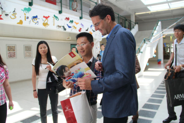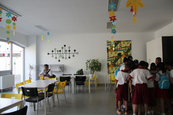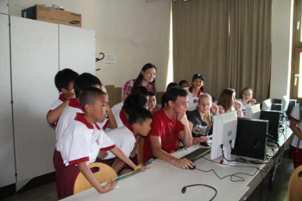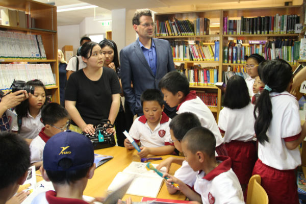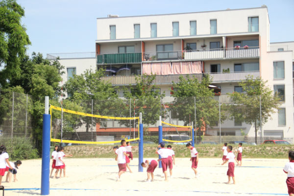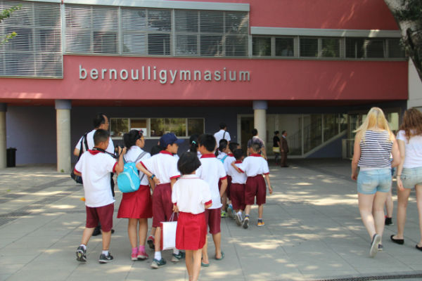 维也纳bernoulligymnasium公立中学全体师生热情接待了我校小泡泡,并带领我校小泡泡参观了学校,走入了学校极具特色的图书馆、科学实验室、美术室、缝纫室、计算机室、常规教室、阶梯教室、室内体育馆、室外操场、托管室等。在此过程中,小泡泡们还在维也纳bernoulligymnasium公立中学的图书馆停留了片刻,阅读了该校哥哥姐姐的读物,体验了国外图书馆阅读规则;同时,小泡泡还快乐地孩子们还如同精灵般脱下了鞋子,奔入操场开心地玩起了沙排,体验着国外多元化的体育课程。