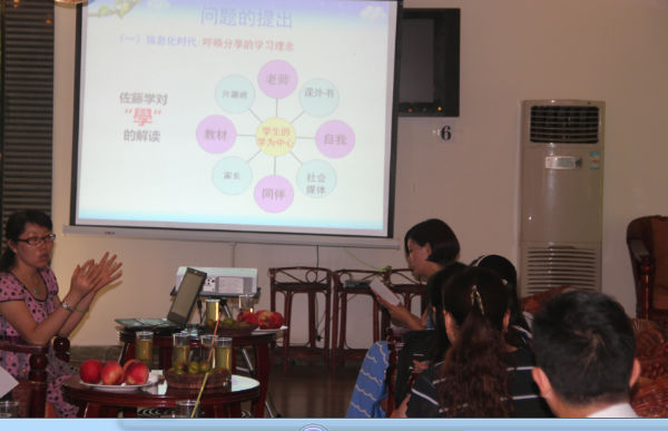 活动开始,游琼英主任从分享式教学的产生,在泡桐树小学天府校区推行过程中遇到的困难,以及如何备好一节分享式的数学常态课和老师们进行了交流,接着,罗艳梅老师则从小学低段的教学中,如何做好常规的准备,如何教会低段的孩子分享,和作为语文教学的几种分享式课型和老师们进行了交流。