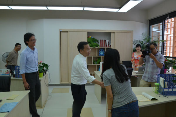 在参观校园过程中,芶鹏校长带领大家参观了学校一区的每一层楼和教室。芶校长从办学理念、学校发展、学生发展、教室文化和环保卫生等多方面为大家做了详细的介绍,在交流的过程中,韩书记对我校的硬件设施与软件设施表示了充分的肯定,也为学校的人性化管理点头称赞,并对学校的软文化设施提出了更高的希望。参过过程中,韩书记一行来到教师办公室,和老师们亲切握手和交流,了解了老师们的工作情况,并对老师们辛苦的付出表示了赞扬。同时也希望老师们全面提升自我,为学生和学校的发展献言献策。