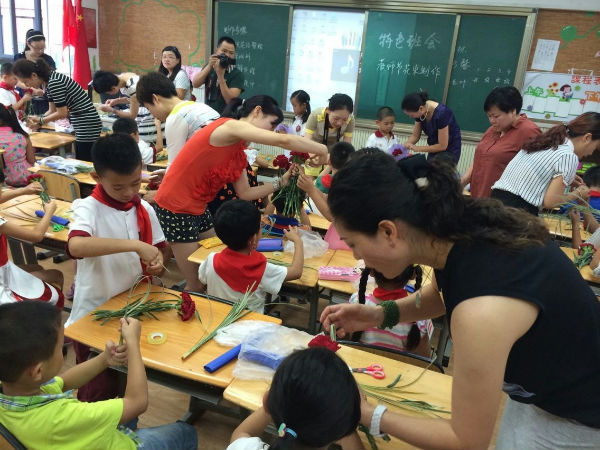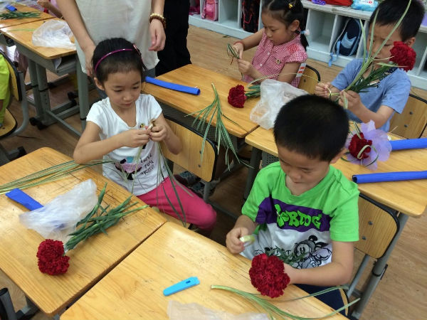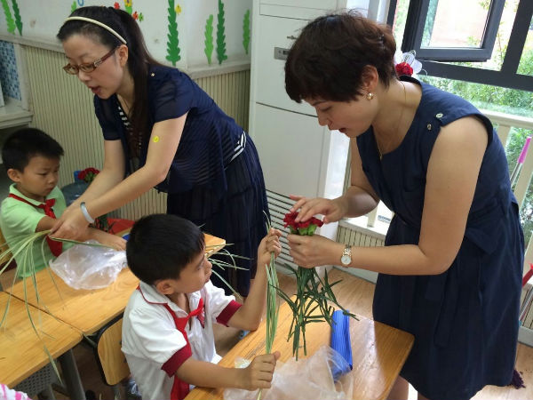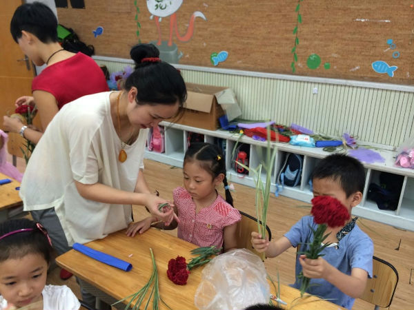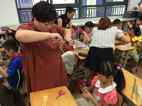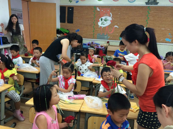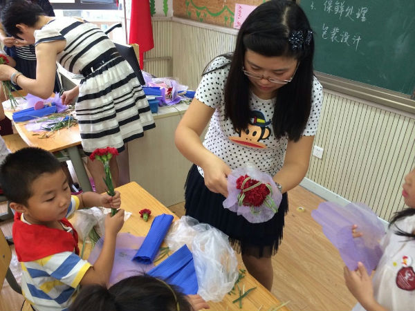 2014年9月10日,一年一度的教师节到来了,这是个向老师感恩的日子。二四班的同学们一大早就来到学校,因为今天有一堂特色班会,大家要为老师们做花束,感谢老师们的关爱和付出。 为此,二四班家委会早就做足了准备,宣传倡议招了十多个大泡泡来帮忙,各种花材满足了所有小泡泡制作花束的需求。8点半特色班会准时开始,大泡泡将花材分发给同学们,同学们认真地跟着插花老师一步步制作花束,遇到困难的时候,一举手就会得到大泡泡的帮助,同学们还在卡片上写出了自己对老师的祝福和感谢。最后,同学们把花束送给了自己喜爱的老师,也送上自己最纯真的祝福,希望老师们节日快乐!
